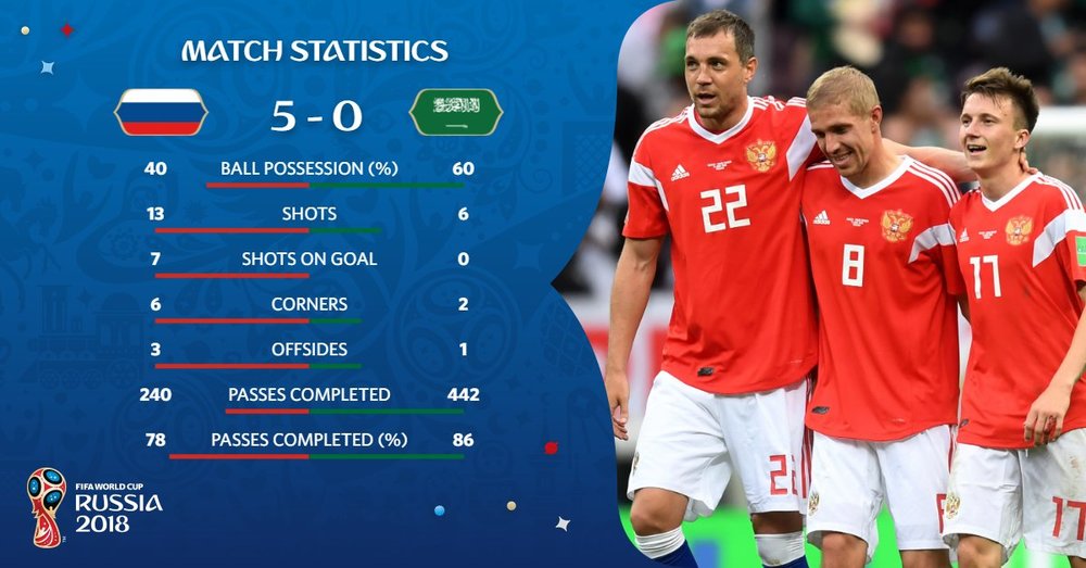 18.40 Вроде как и лучше смотрится Россия, но по владению мячом статистика удивительная - 42/58, то есть мячом больше владеют гости. Есть мнение, что если против Саудовской Аравии играют подопечные Черчесова вторым номером, то против Египта и Уругвая попробуют тоже. Только не факт, что получится - там сильнее исполнители.