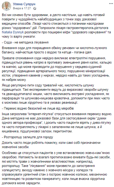 Исполняющая обязанности министра здравоохранения Украины Ульяна Супрун назвала мифами распространенные среди украинцев способы улучшения здоровья.