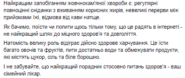 Она отметила, что лучшим предотвращением желчнокаменной болезни являются регулярные полноценные завтраки с употреблением полезных жиров, небольшие перерывы между приемами пищи, отказ от кофе натощак. Также Супрун добавила, что большую роль на пути к крепкому здоровью играет действительно здоровое питание: необходимо есть много овощей и фруктов, пить достаточно воды и ограничивать продукты, содержащие сахар, соль и белую муку.