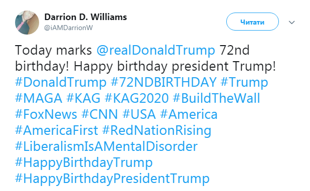 Однако даже в свой День рождения президент США не забыл про политических оппонентов из Демпартии и "охоту на ведьм" о расследовании неподтвержденного вмешательства России в президентские выборы. С самого утра в Twitter он начал "разносить" демократов.