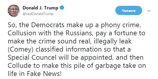 Таким образом, представители Демпартии создают фальшивое преступление, сговор с русскими, платят целое состояние, чтобы заставить его казаться реальным, (организуют - Прим.Ред.) незаконную утечку секретной информации Коми (экс-главы ФБР - Прим.Ред.) , чтобы назначить специальный совет, а затем сговариваются, чтобы эту кучу мусора вылили в жизнь в фейковых новостях!