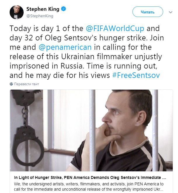 "В первый день чемпионата мира по футболу исполнится 32 день голодовки Олега Сенцова. Присоединяйтесь ко мне и PEN America, чтобы добиться освобождения украинского режиссера, который был незаконно заключен в России. Времени в обрез, он может умереть за свои взгляды", – написал Стивен Кинг.