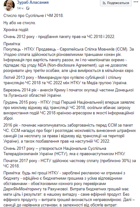 12:45 Глава Общественного ТВ Украины Зураб Аласания рассказал, почему нардепы так и не отважились запретить трансляцию ЧМ-2018 в Украине - права на которую выкупил телеканал "Интер".