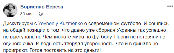 14:21 "Давно уже сборная Украины так успешно не выступала на Чемпионате мира по футболу. Парни не потеряли не единого очка. И ведь есть твердая уверенность, что и в финале не проиграют. Готов поставить на это деньги!", - пишет в Facebook нардеп Борислав Береза.