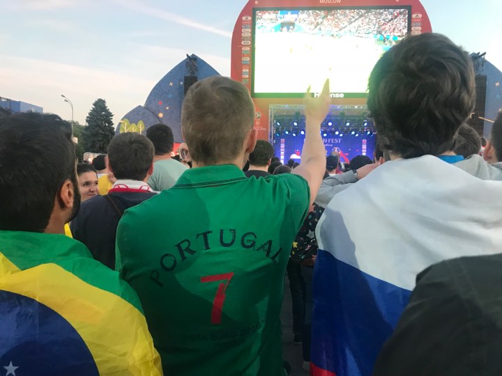 После того, как Криштиану Роналду забил второй гол португальские болельщики в московской фан-зоне начали распевать его имя.