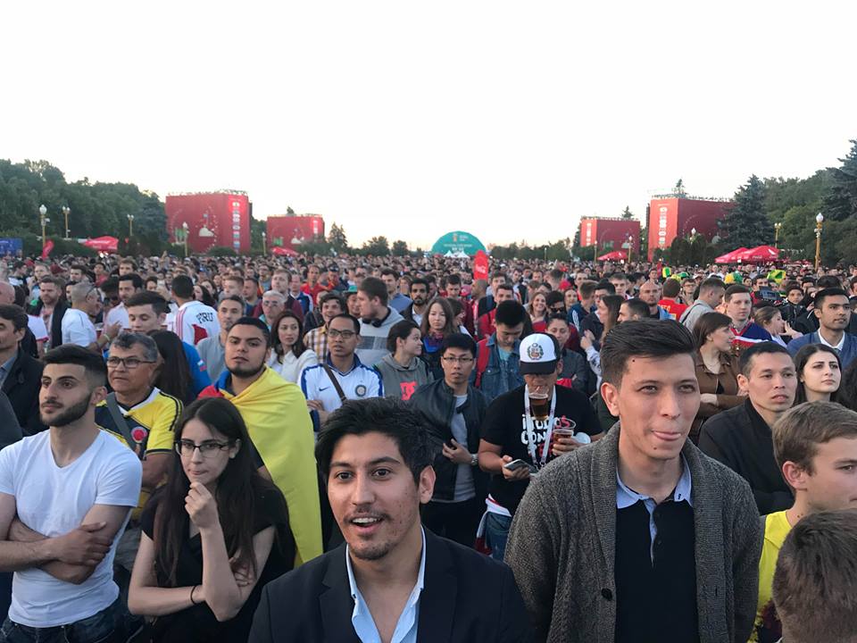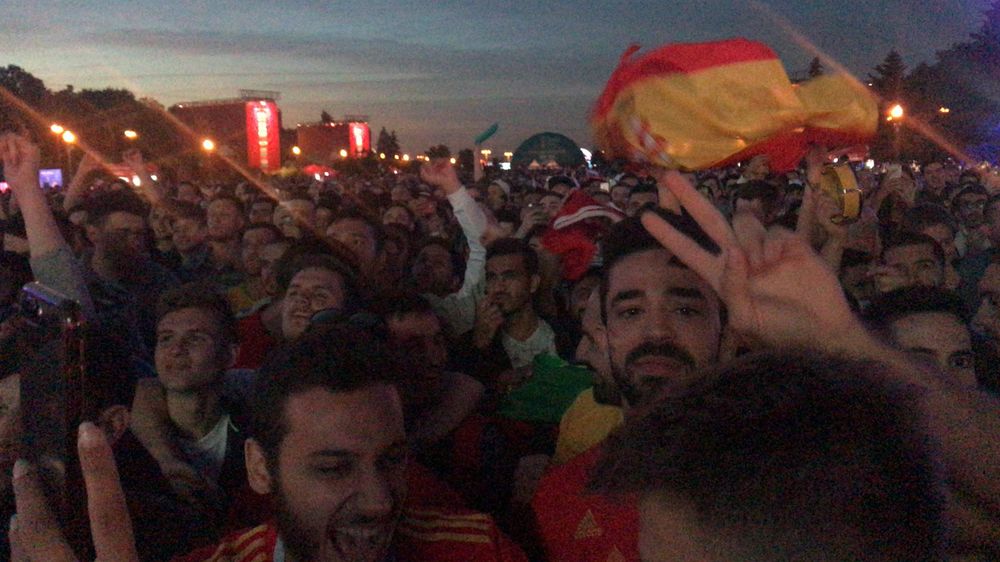 А вот так отмечают испанские болельщики в московской фан-зоне отмечают перехват лидерства в матче.