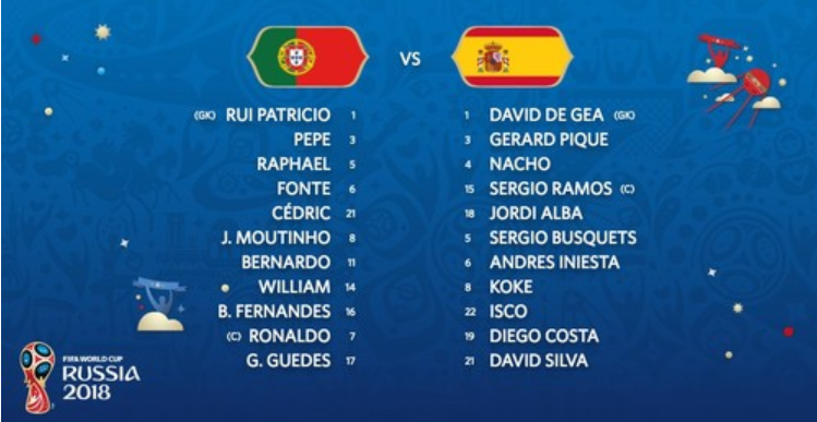 Испания: де Хеа, Начо, Пике, Рамос, Альба, Коке, Бускетс, Иньеста, Сильва, Иско, Диего Коста.