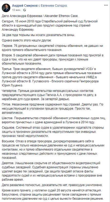 Старобельский районный суд Луганской области в одиннадцатый раз продлил содержание под стражей экс-главе фракции Партии регионов и бывшему губернатору Луганской области Александру Ефремову. Об этом на своей странице в Facebook сообщил адвокат Ефремова Андрей Смирнов.
