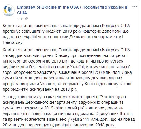 "Комитет по вопросам ассигнований Палаты представителей Конгресса США утвердил собственный проект "Закона об ассигнованиях на нужды Министерства обороны на 2019", где средства, которые предлагается выделить на помощь Украине в сфере безопасности, в том числе летальное оружие оборонительного характера, определены в объеме $250 млн. Данная сумма на $50 млн превышает ассигнования для соответствующих программ поддержки Украины, утвержденных в консолидированном законе о бюджетных ассигнованиях на 2018 год", – говорится в сообщении.