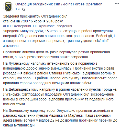За минувшие сутки на Донбассе сепаратисты 36 раз проводили обстрел украинских позиций ВСУ. Об этом сообщает штаб ООС в Facebook.