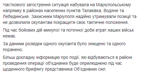 На Луганском направлении интенсивность боев значительно снизилась, однако противник снова сорвал разведения войск в районе Станицы Луганской, открыв огонь из стрелкового оружия.