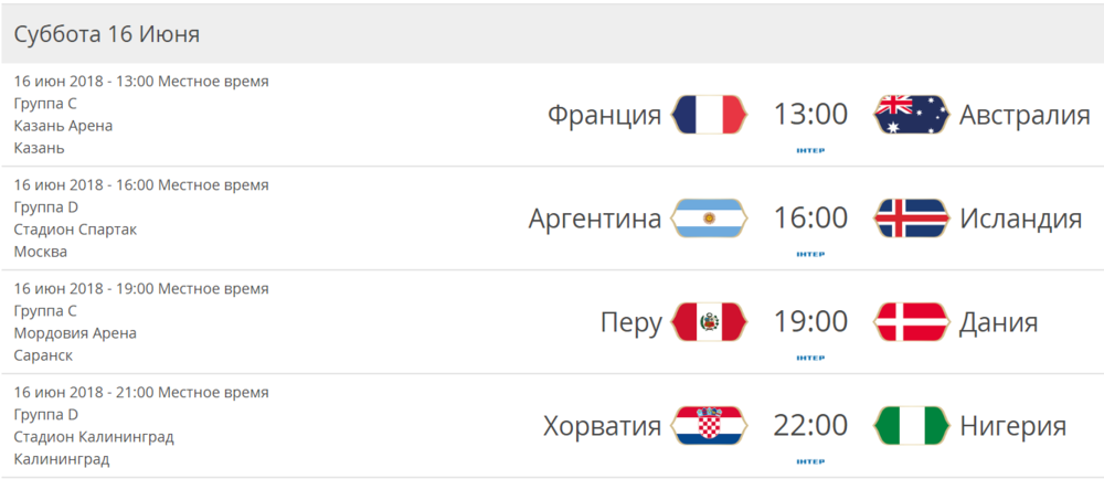 Расписание ЧМ-2018 на 16 июня