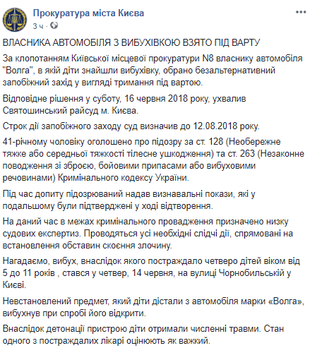Взрыв, в результате которого пострадали четверо детей в возрасте от 5 до 11 лет, произошел в четверг, 14 июня, на улице Чернобыльской в Киеве. Неустановленный предмет, который дети получили из автомобиля марки "Волга", взорвался при попытке его открыть. Вследствие детонации устройства дети получили многочисленные травмы. Состояние одного из пострадавших врачи оценивают как тяжелое.