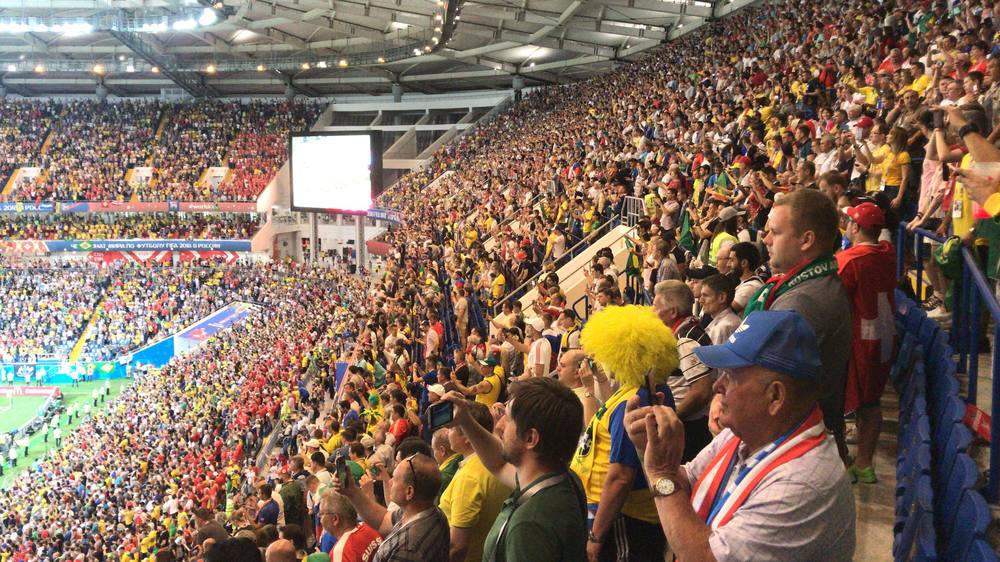 21.24 Болельщики сборной Бразилии ликуют на стадионе в Ростове-на-Дону.