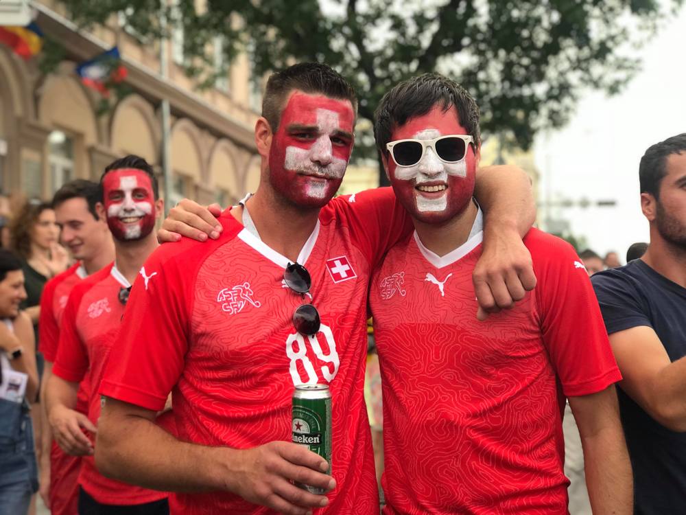 Двое парней из городка с труднопроизносимым названием прибыли в Ростов на матч с Бразилией. Для опознания свой-чужой фаны держат головку швейцарского сыра.