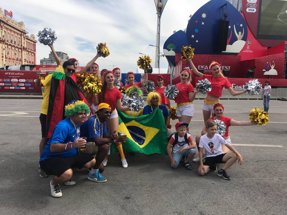 15:30 На улицах Ростова гуляют фанаты сборной Бразилии. С каждой минутой все больше бразильцев прибывают в фан-зону. Их явно больше, чем швейцарских болельщиков, которые недавно едва не заехали на территорию так называемой "ДНР", добираясь до стадиона в России.