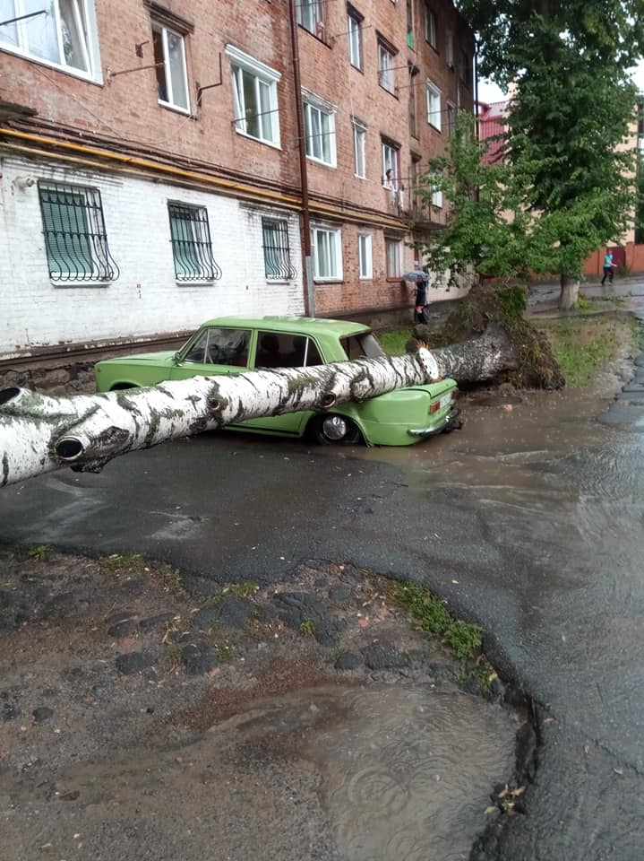 Березу вырвало с корнем и повалило на припаркованный автомобиль, фото: Станіслав Нижник-Оскольський/Facebook