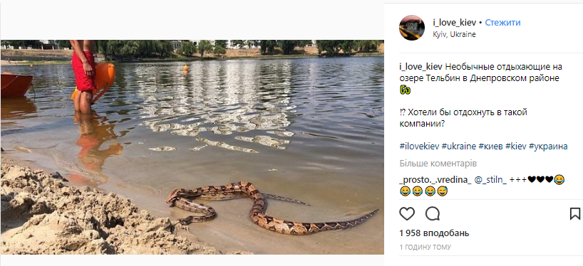 В Киеве, на пляже озера Тельбин заметили не совсем обычных отдыхающих. Фото двух плавающих в озере питонов заинтересовали соцсети. Публикации появились в Facebook в группе "Наш дом Березняки" и в Instagram.