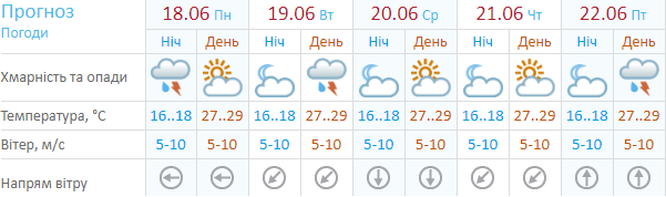 По данным сайта Sinoptik.ua, считает, что гроза будет в пятницу и субботу. Дневная температура +28...+29. В воскресенье столбик термометра днем опустится до +22.
