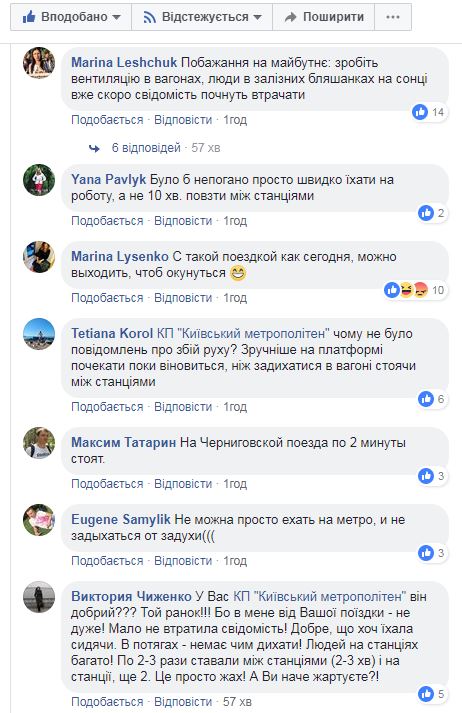 А вот в соцсетях пользователи рассказывают о пережитом утре. "Почему не было сообщений о сбое движения? Удобнее на платформе подождать пока возобновится движение, чем задыхаться в вагоне стоя между станциями", - пишет Татьяна Король в Facebook.