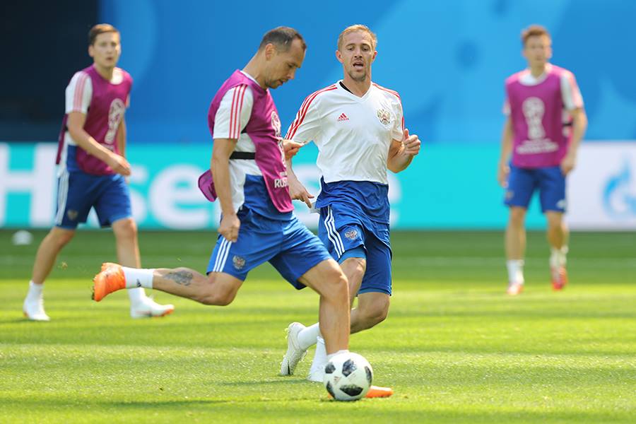 Россия: Акинфеев - защита Фернандес, Игнашевич, Кутепов, Жирков - полузащита Газинский, Зобнин Самедов, Головин, Черышев - нападение Дзюба