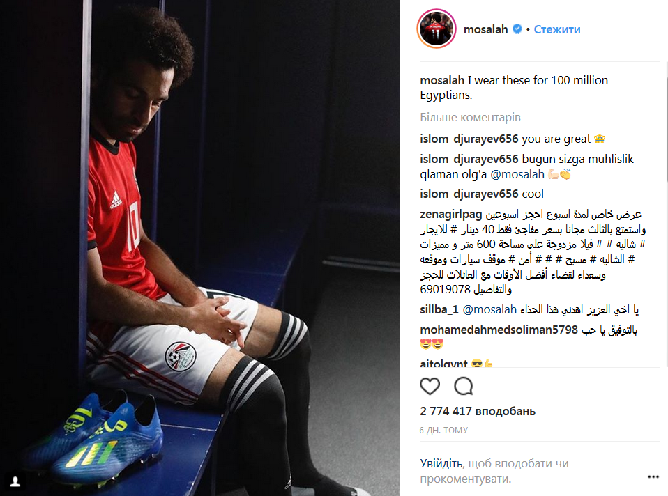 Салах трогательно обратился к болельщикам в своем Instagram. Он разместил фото, на котором смотрит на бутсы и написал: "Я надеваю их ради 100 миллионов египтян".