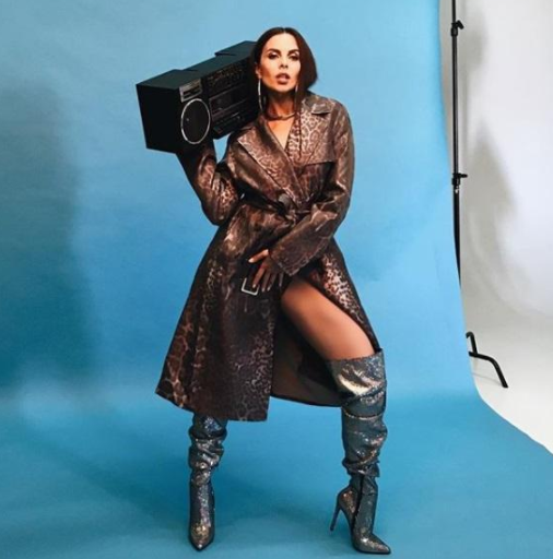 На опубликованном в Instagram снимке звезда позирует в леопардовом плаще и высоких кожаных сапогах в стилистике 80-м. На плече певицы - раритетная магнитола  Fisher.