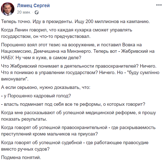 "Действия Порошенко по назначению Жебривского живо напоминают мне позднего Ющенко. Когда впереди выборы, а рейтинг низок. Когда ситуацию нужно срочно исправлять, но доверенных лиц мало, а ключевых должностей много. Да и доверенные лица не так уж хороши, как хотелось бы...".