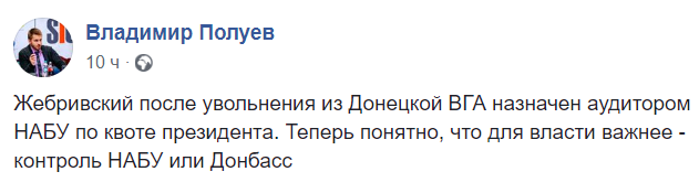 "Теперь понятно, что для власти важнее - контроль НАБУ или Донбасс", - делает вывод из назначения Жебривского журналист Владимир Полуев.