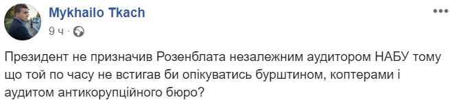 "Президент не назначил Розенблата независимым аудитором НАБУ потому, что тот по времени не успевал бы заниматься янтарем, коптерами и аудитом антикоррупционного бюро?"