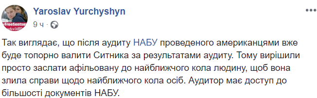 "Похоже, что после аудита НАБУ, проведенного американцами, уже будет топорно валить Сытника по результатам аудита. Поэтому решили просто прислать аффилированного в ближайший круг человека, чтобы он слил дела в отношении ближайшего круга лиц. Аудитор имеет доступ к большинству документов НАБУ", - предполагает глава Transparensy в Украине Ярослав Юрчишин.