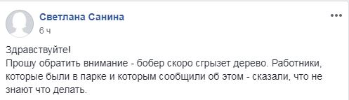 "Прошу обратить внимание - бобер скоро сгрызет дерево. Работники, которые были в парке и которым сообщили об этом, сказали, что не знают, что делать", - написала Светлана.