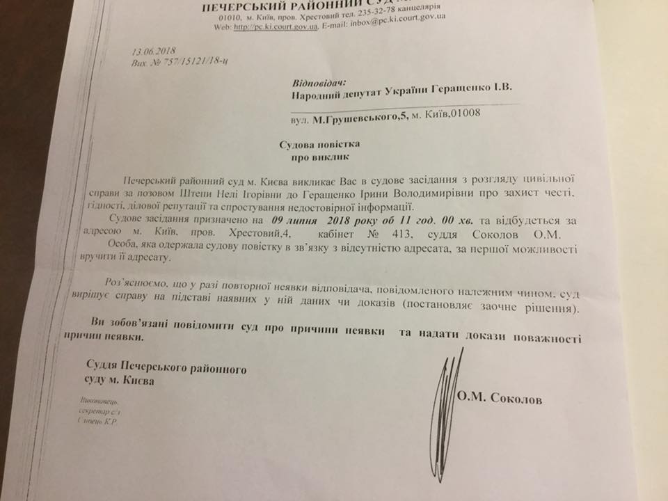 "Это просто праздник какой-то. После беркутовцев, обвиняемых в причастности к убийствам на Майдане, которые подали на меня в суд по делу "защиты чести и достоинства", теперь еще и Неля Штепа, которая звала "русский мир" на Донбасс, решила со мной судиться, и тоже, в деле "чести и достоинства"", - сообщила Геращенко.
