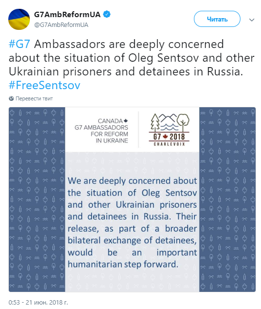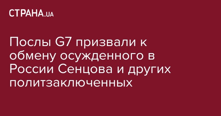 Послы стран "Большой семерки" выступают за обмен заключенных в России режиссера Олега Сенцова и других украинских политзаключенных с целью их освобождения.