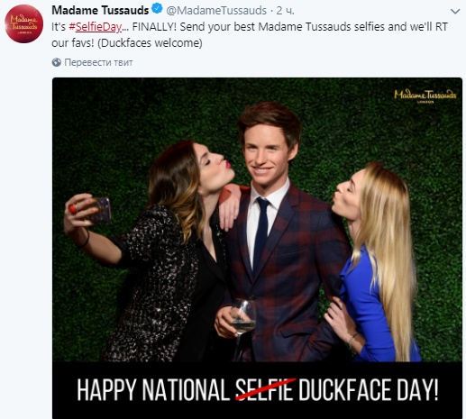 А музей мадам Тюссо в Лондоне просто обнародовал фото с надписью "Счастливого национального Дня Duckface", подшутив над барышнями, которые любят фотографировать с фирменными выпяченными губами.