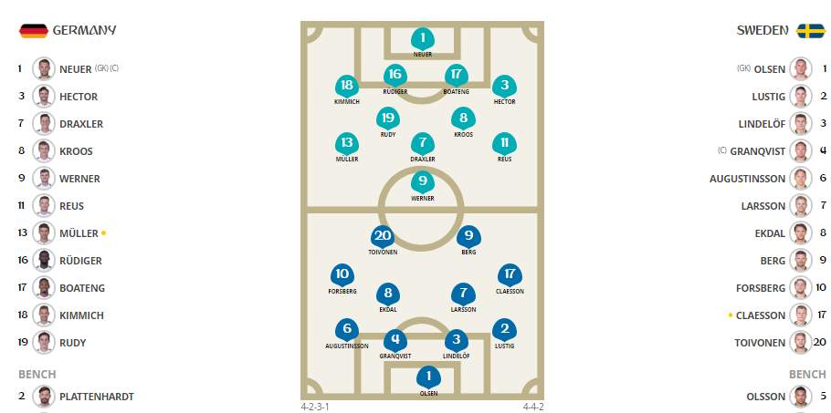 Германия: Нойер - защита Боатенг, Рюдигер, Киммих, Гектор - полузащита Дракслер, Мюллер, Кроос, Ройс, Руди - атака Вернер