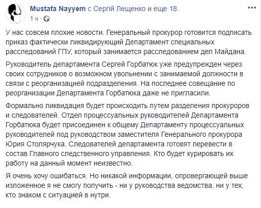 "Руководитель департамента Сергей Горбатюк уже предупрежден через своих сотрудников об увольнении с занимаемой должности в связи с реорганизацией подразделения. На последнее совещание по реорганизации Департамента Горбатюка даже не пригласили", - написал Найем на своей странице в соцсети Facebook в пятницу вечером.