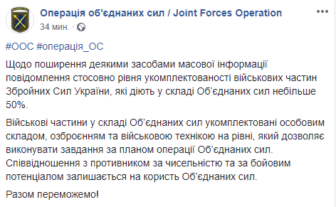 "Воинские части в составе Объединенных сил укомплектованы личным составом, вооружением и военной техникой на уровне, который позволяет выполнять задачи по плану операции Объединенных сил", - говорится в сообщении.