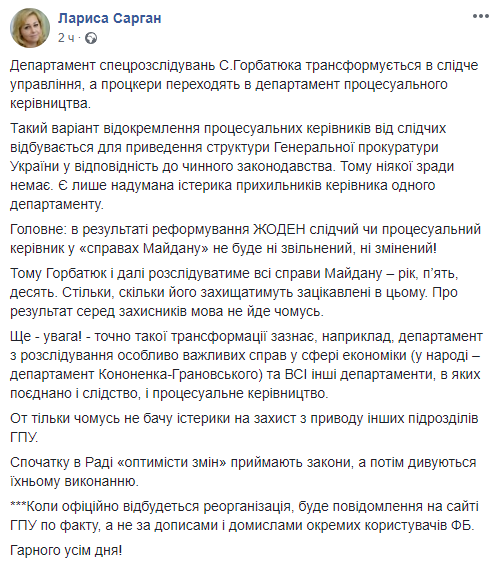 Пресс-секретарь генпрокурора Лариса Сарган сообщила, что Департамент спецрасследований ГПУ не будет ликвидирован. Об это она сообщила в Facebook.