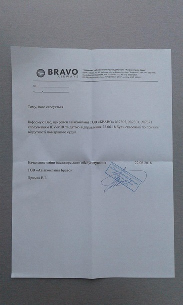 "Ночью 22 июня, когда мы уже были в дороге, наш турагент прислала сообщение о том, что вылет переносится на 22.06, 21.30. В 7 утра представитель Bravo Airways в Жулянах сказала, что рейс изначально был запланирован на 21.30, и все претензии мы должны предъявлять своему туроператору (вечером оказалось, что это обыкновенная ложь)", - рассказали Виктория и Наталья, отметив, что им пришлось за свой счет снять номер в отеле.