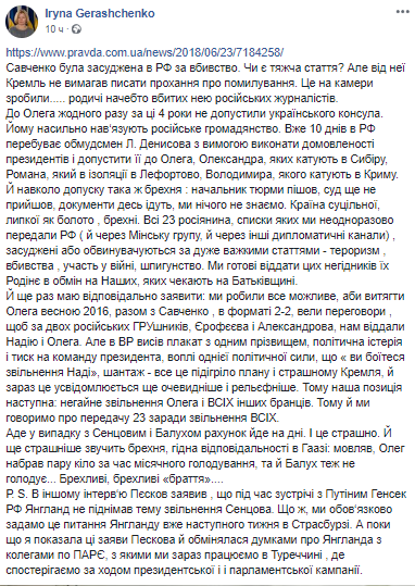 "Сейчас страшный план Кремля осознается еще яснее и рельефнее. Поэтому наша позиция является такой: немедленное освобождение Олега Сенцова и всех остальных пленников. Поэтому мы говорим о передаче 23 ради освобождения всех. Ведь в случае с Сенцовым и Балухом счет идет на дни. И это страшно. И еще страшнее звучит ложь, достойная ответственности в Гааге: мол, Олег набрал несколько килограммов за время месячного голодания и Балух тоже не голодает... Лживые, лживые "братья", - подчеркнула Геращенко.