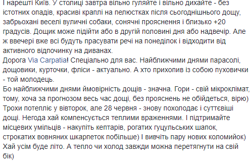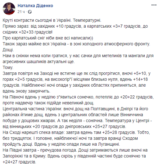 "Относительно температуры, то на Винницкой области столбики термометров поднимутся до +20 градусов, а на Днепропетровщине - к +25 - +27 градусов. На востоке наконец жара упадет: днем 24 июня там ожидается +25 - +28 градусов и пройдут дожди. На Юге же ожидается прекрасная погода: будет солнечно и +24 - +27 градусов", - добавляет она.