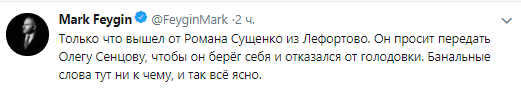 "Только что вышел от Романа Сущенко из "Лефортово". Он просит передать Олегу Сенцову, чтобы он берег себя и отказался от голодовки. Банальные слова здесь ни к чему, и так все ясно", - заявил он.