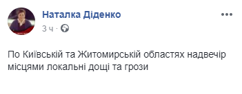 "По Киевской и Житомирской областях вечером местами локальные дожди и грозы,"- написала она.