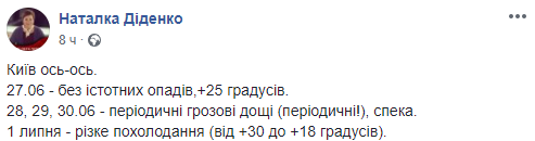 По ее информации 27.06 - в столице без существенных осадков, + 25 градусов. С 28, 29, 30.06 - периодические грозовые дожди, жара. 1 июля - резкое похолодание (с +30 до +18 градусов).