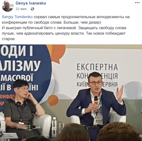 "Сергей Томиленко сорвал самые продолжительные аплодисменты на конференции по свободе слова. Больше, чем Дезир. И выиграл публичный батл с Лигачевой. Защищать свободу слова лучше, чем адвокатировать цензуру власти. Так новое побеждает старое", - описал происходящее на конференции журналист Денис Иванеско.