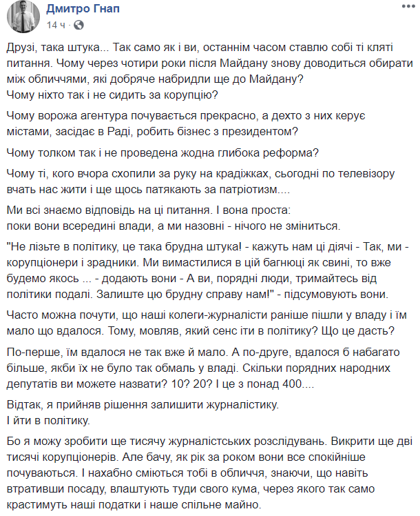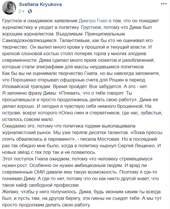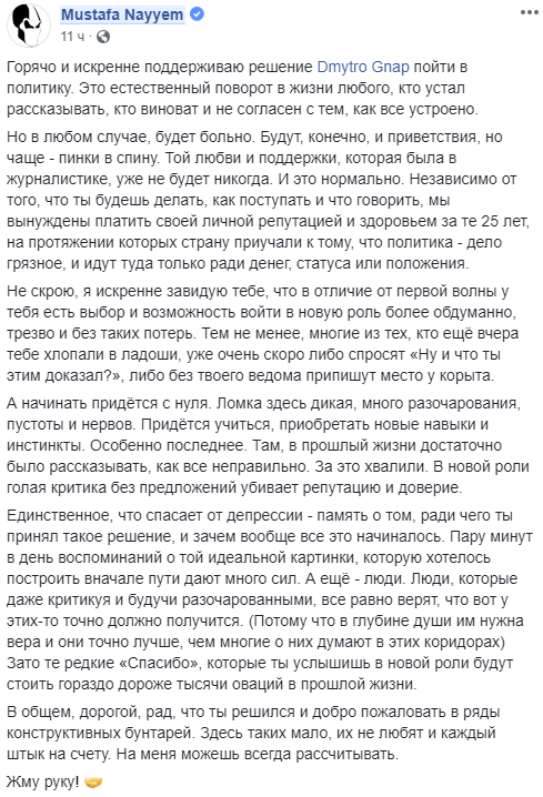 "Грустное и ожидаемое заявление Дмитрия Гнапа о том, что он покидает журналистику и уходит в политику. Грустное, потому что Дима был хорошим журналистом. Въедливым. Принципиальным. Самовдохновляющимся. Талантливым, как бы кто ни оценивал его творчество. Он выпил много крови у прошлой и текущей власти. И крепкой слоновой костью стоял поперек горла у многих злодеев современности. Дима сделал много ярких сюжетов и разоблачений, которые стали эпиграфами для массы неудавшихся политиков.