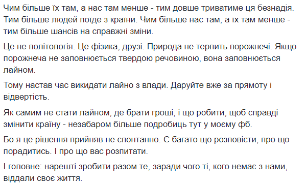 "Горячо и искренне поддерживаю решение Dmytro Gnap пойти в политику. Это естественный поворот в жизни любого, кто устал рассказывать, кто виноват и не согласен с тем, как все устроено.