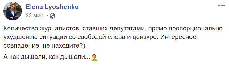 "Количество журналистов, ставших депутатами, прямо пропорционально ухудшению ситуации со свободой слова и цензуре. Интересное совпадение, не находите?" – отмечает адвокат Елена Лешенко.