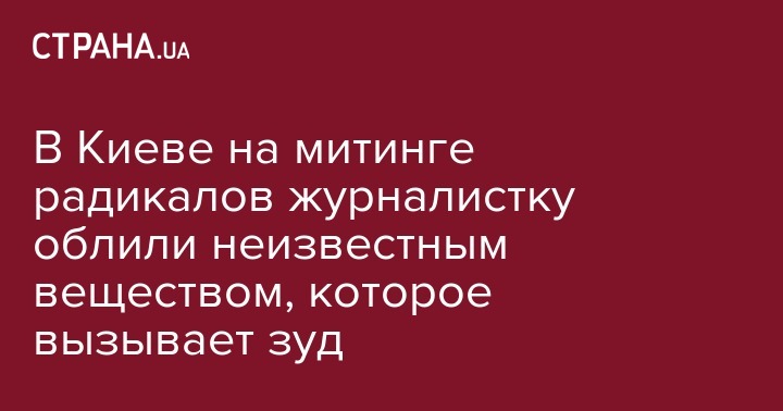 В Киеве на митинге журналистку облили неизвестным химическим веществом. После контакта с жидкостью кожа журналистки покрылась красными пятнами, начала зудеть, а сама Антонина Белоглазова, которая работает сразу в трех СМИ - информационном агентстве "Медиа-поток", информационно-аналитическом сайте "Правовой контроль" и на YouTube канале Анатолия Шария, почувствовала головокружение и тяжесть дыхания. Об этом говорится в сообщении НСЖУ